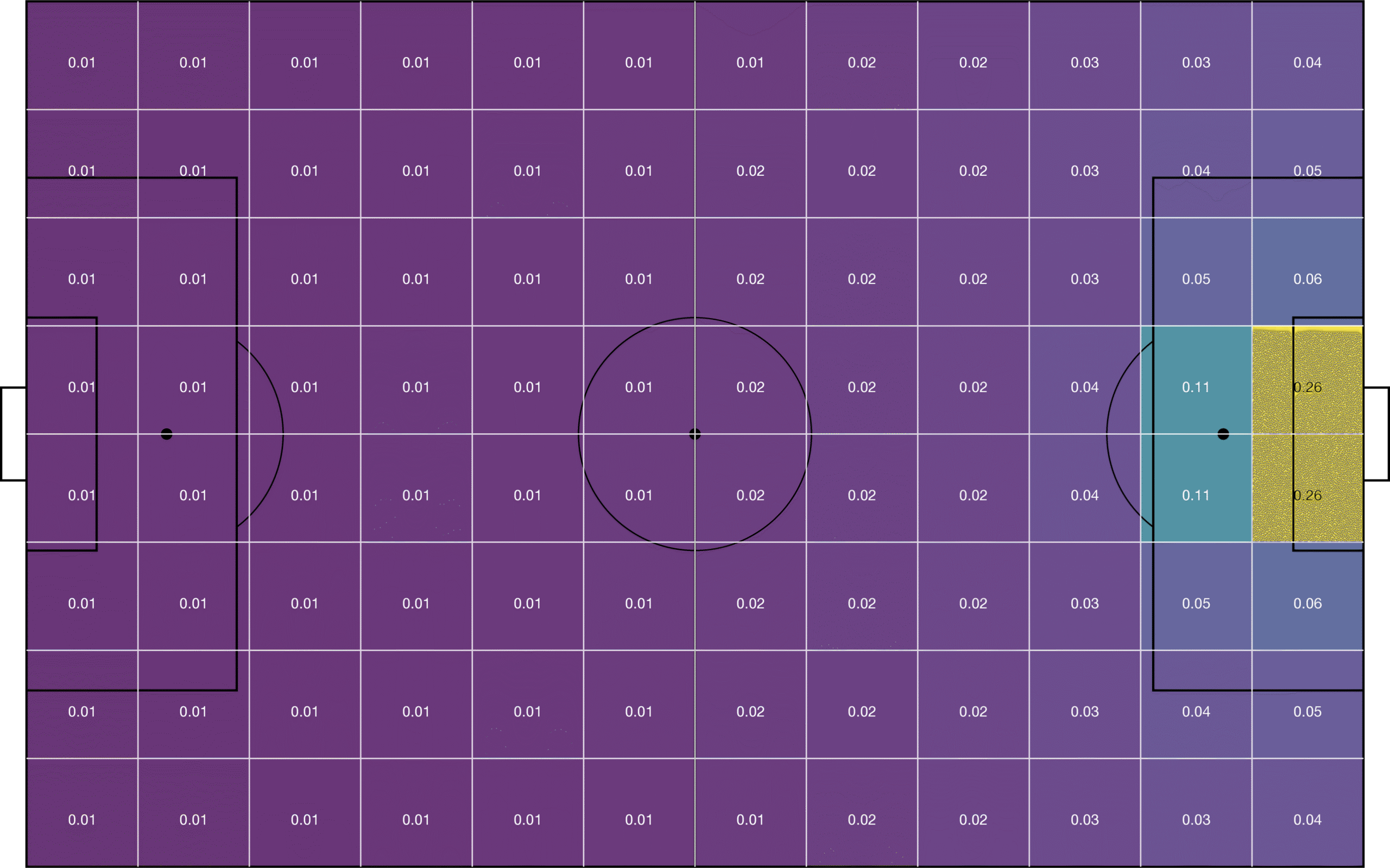- Le concept : Le terrain est divisé en une grille (grid) de zones. Chaque zone possède une probabilité de marquer (si on a le ballon ici, on a X% de chance de marquer dans les 10 prochaines secondes).